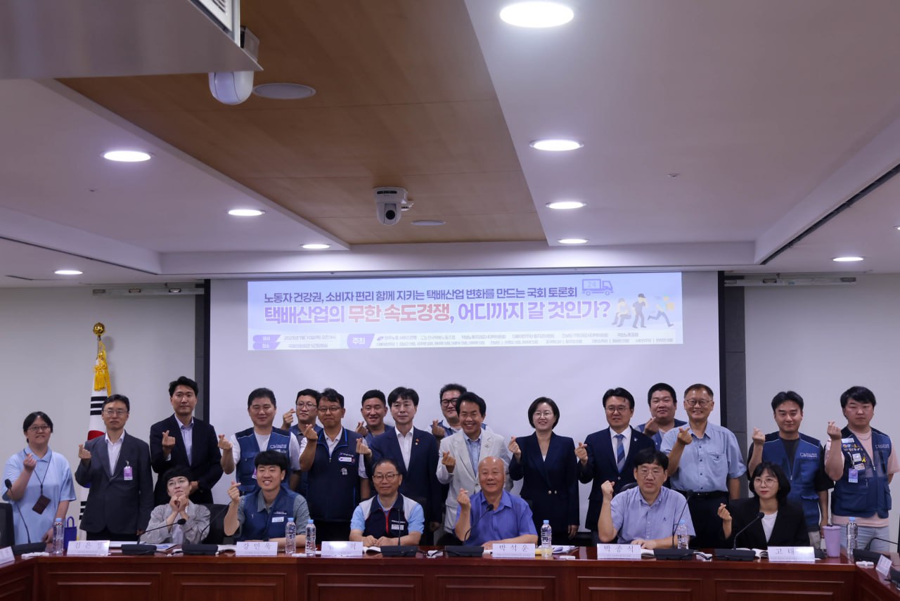 ‘택배 무한속도경쟁, 어디까지 갈 것인가’ 국회 토론회가 열렸습니다. 이번 토론회는 서비스연맹과 전국택배노동조합, 택배노동자과로사대책위, 국회노동포럼, 더불어민주당 을지로위원회, 진보당 쿠팡과로사대책위의 주최로 열렸으며 민주당·진보당·조국혁신당·기본소득당·사회민주당 국회의원들도 대거 함께했습니다.