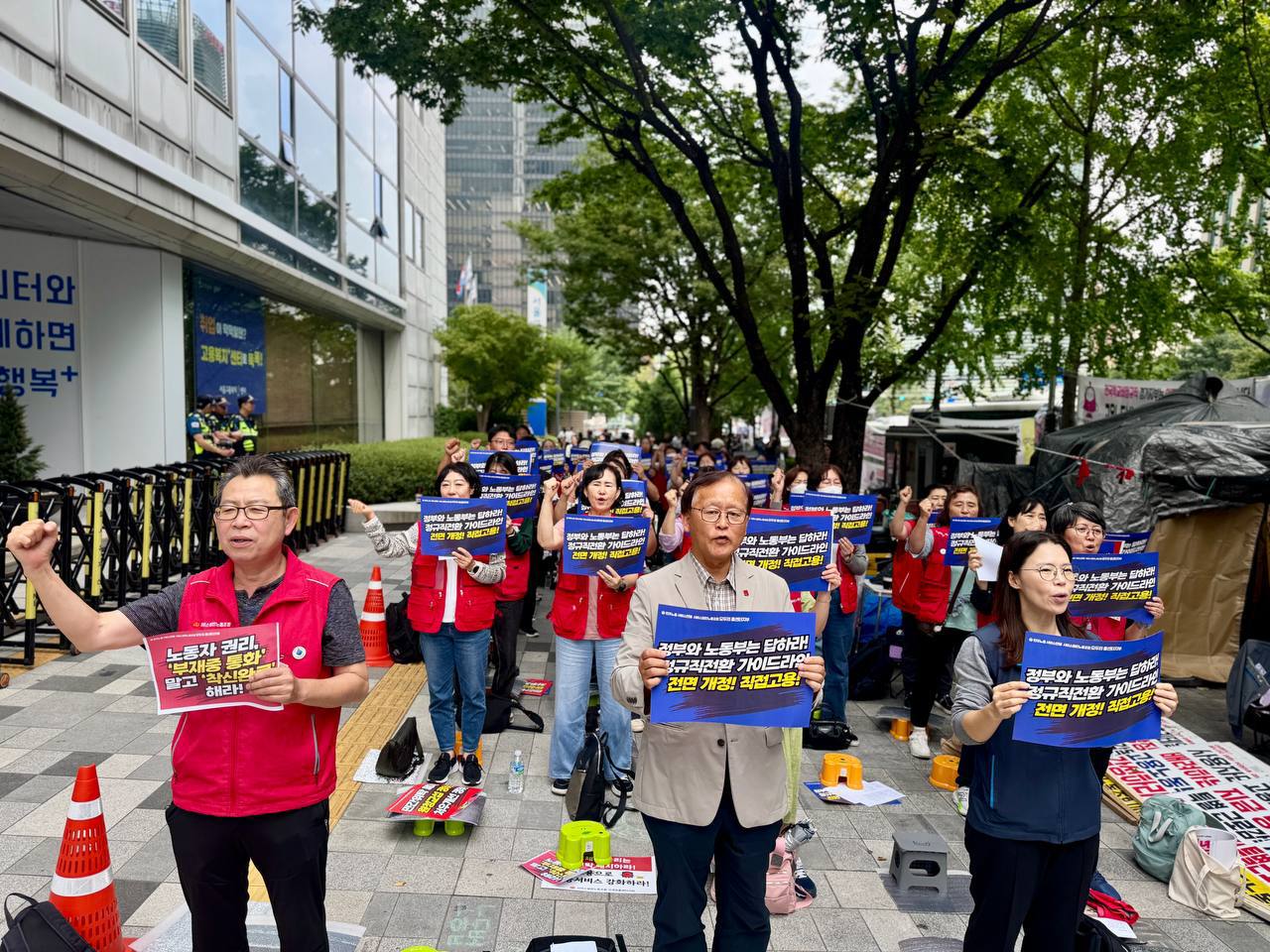 우리는 원청 교섭을 통해 직접고용을 쟁취하는 선봉에 설 것입니다. 공공·민간 콜센터 차별 없는 정규직 전환 가이드라인 전면 개정하라! 전 조합원 총단결로 원청교섭과 처우개선을 반드시 쟁취하자! 모두의 힘으로 세상을 바꾸자!