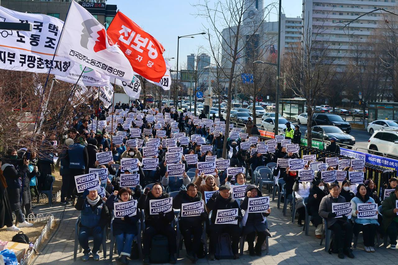 노동자와 소비자, 중소상공인들이 쿠팡 본사 앞에 모여 김범석 쿠팡 의장의 책임을 요구했습니다。
