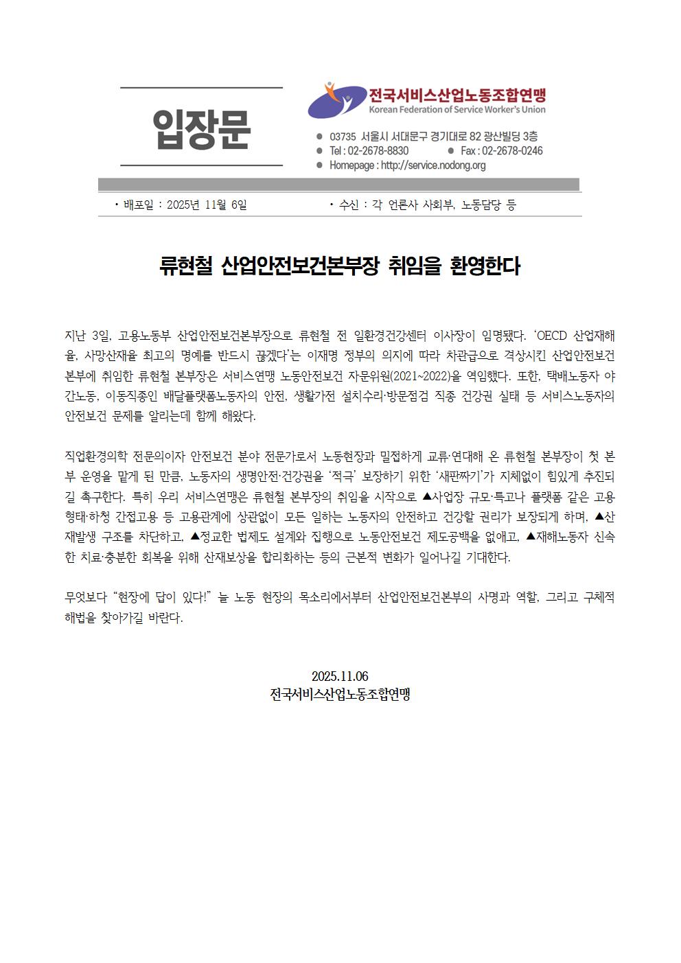 [입장문] 류현철 산업안전보건본부장 취임을 환영한다