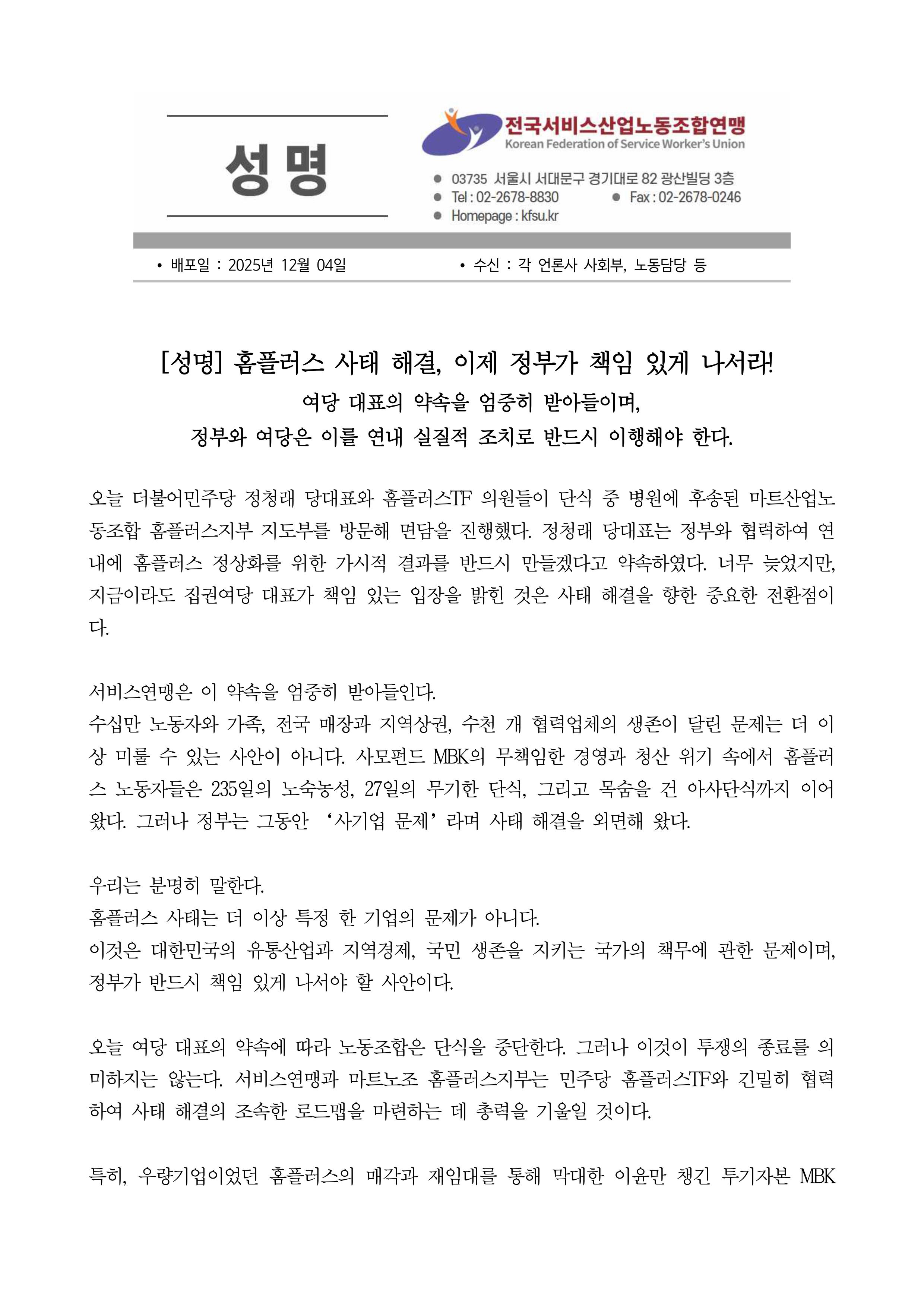 [성명] 홈플러스 사태 해결, 이제 정부가 책임 있게 나서라! 여당 대표의 약속을 엄중히 받아들이며, 정부와 여당은 이를 연내 실질적 조치로 반드시 이행해야 한다.