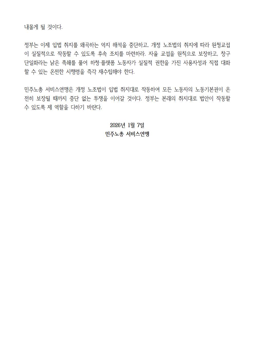 [성명] 정부는 혼란을 키우지 말고 노조법 취지에 맞게 원청교섭 보장 시행령을 즉각 마련하라.